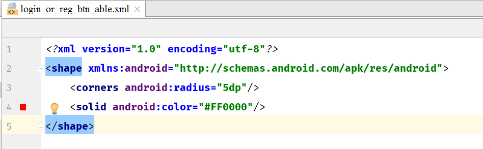 <shape xmlns:android="http://schemas.android.com/apk/res/android"> <corners android:radius="5dp"/> <solid android:color="#FF0000"/> </shape>