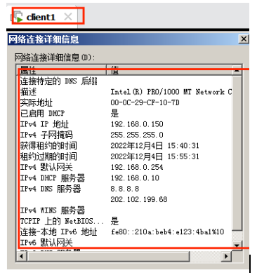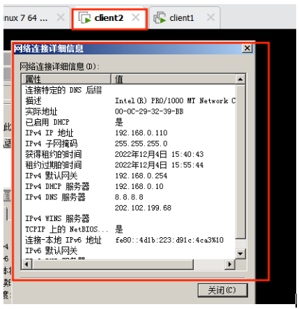 5、分别在client1和client2上查看是否从dhcp服务器上成功获取到IP地址:
