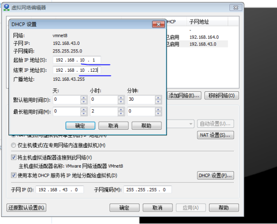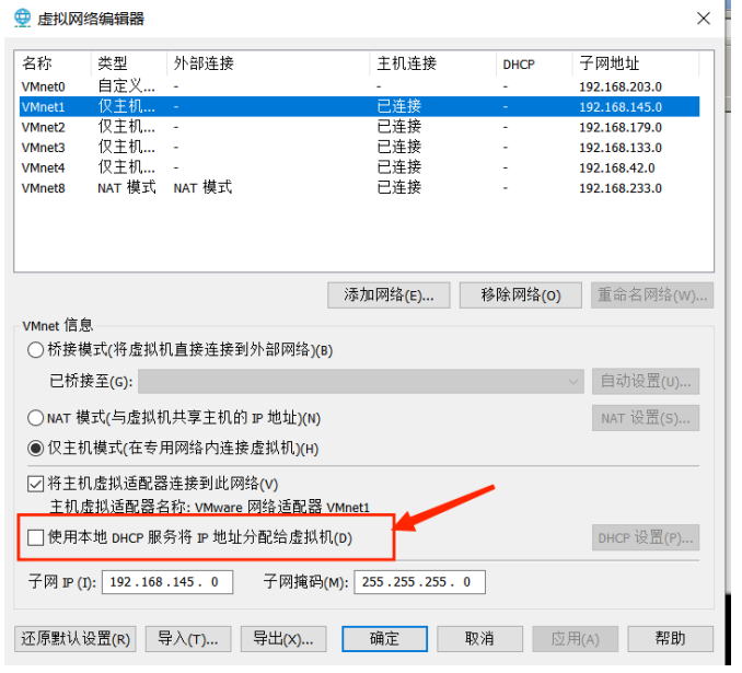 1)保证dhcp客户端和dhcp服务器能够相互连通,可设置网络连接模式均为vmnet1 仅主机模式,首先在虚拟网络编辑器中将本地DHCP服务取消。