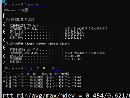 物理机:按Windows键 cmd进入命令行模式,查看IP地址,网络连通