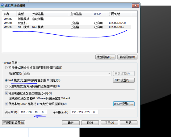 由于使用模板机,网络配置默认为192.168.10.10,所以需要调整虚拟机的网络编辑器,VMnet8网段调整到192.168.10.的段,