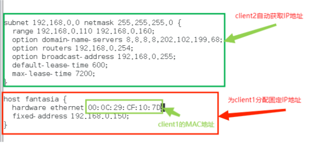 为物理地址为00:0C:29:CF:10:7D的客户端client1,分配固定的IP地址,地址为192.168.0.150,而客户端client2采用自动获取方式配置IP等地址信息。