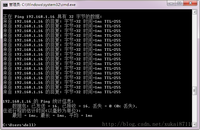 此时网卡的静态IP地址为192.168.1.16,通过ping指令发送16个数据包
