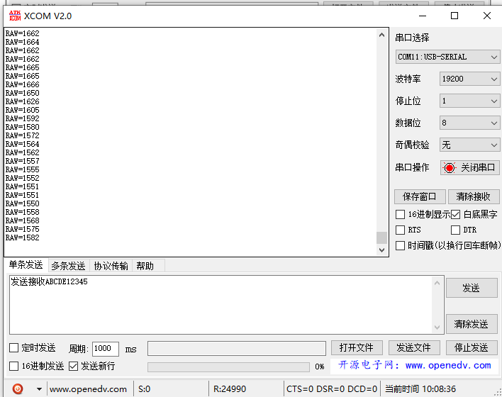 再次运行调试,在上位机的仿真串口软件中接收到了上传的数据:
