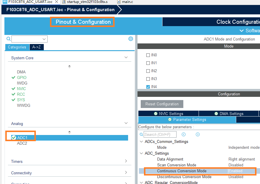 上面的程序,即使模拟量输入值发生变化,AD转换的数据值也是固定不变的。原因是ADC设置里面没有打开连续转换模式: