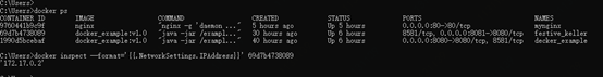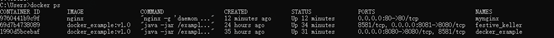 参考上面的命令 因为是我是在windows环境弄的,Windows路径需要\斜线来指定路径,我的文件均在D盘docker\nginx文件夹下处理 然后执行上面的命令启动nginx加载本地自定义文件。然后使用 docker exec -it id /bin/bash 命令进入docker 容器,查看下当前docker容器内数据是否已经被指定文件覆盖。 然后启动两个java程序,然后查看docker运行时容器有哪些 检查启动是否成功