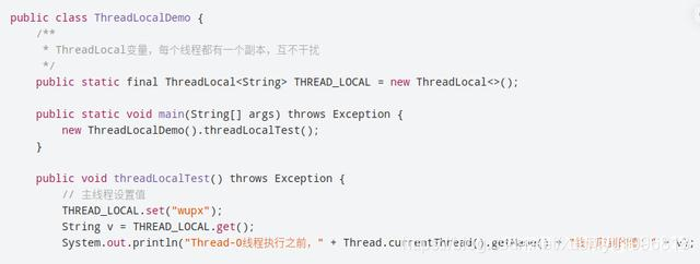 ThreadLocal 提供了线程本地的实例。它与普通变量的区别在于,每个使用该变量的线程都会初始化一个完全独立的实例副本。ThreadLocal 变量通常被private static修饰。当一个线程结束时,它所使用的所有 ThreadLocal 相对的实例副本都可被回收。