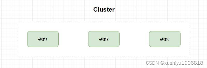 比如,我现在有一个秒杀服务,并发量太大单机系统承受不住,那我加几台服务器也 一样 提供秒杀服务,这个时候就是 Cluster 集群 。