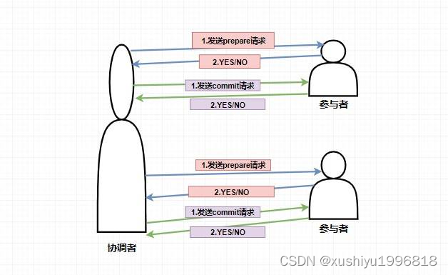 在两阶段提交中,主要涉及到两个角色,分别是协调者和参与者。