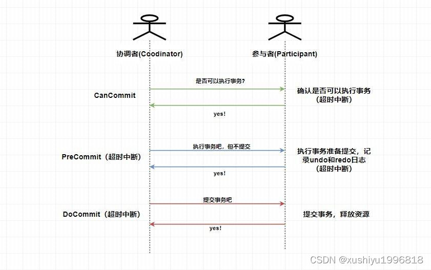 PreCommit阶段:协调者根据参与者返回的响应来决定是否可以进行下面的 PreCommit 操作。如果上面参与者返回的都是 YES,那么协调者将向所有参与者发送 PreCommit 预提交请求,参与者收到预提交请求后,会进行事务的执行操作,并将 Undo 和 Redo 信息写入事务日志中 ,最后如果参与者顺利执行了事务则给协调者返回成功的响应。如果在第一阶段协调者收到了 任何一个 NO 的信息,或者 在一定时间内 并没有收到全部的参与者的响应,那么就会中断事务,它会向所有参与者发送中断请求(abort),参与者收到中断请求之后会立即中断事务,或者在一定时间内没有收到协调者的请求,它也会中断事务。