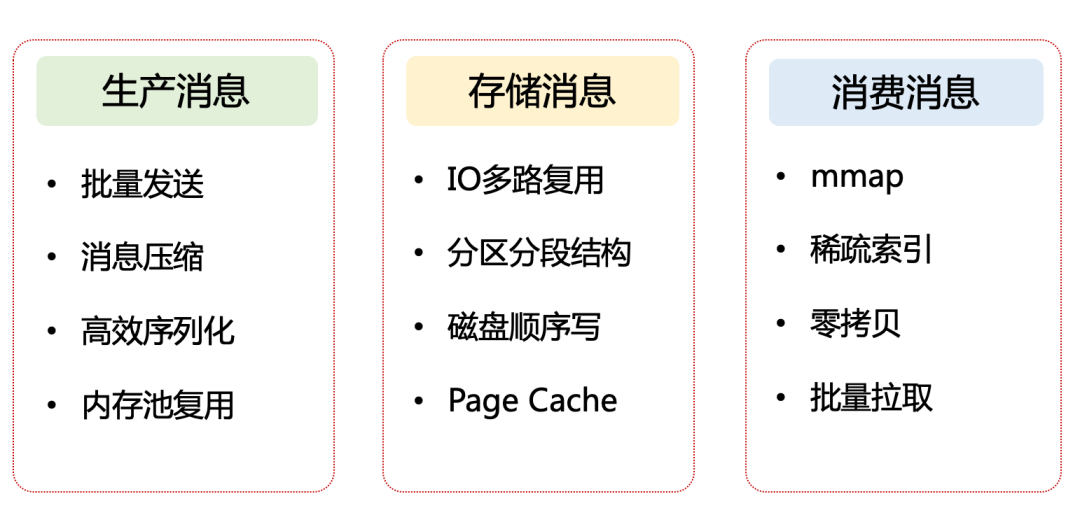 我们完全可以顺着这条主线去做结构化梳理。基于这个思路,便形成了下面这张 Kafka 高性能设计的全景图,我按照生产消息、存储消息、消费消息 3 个模块,将 Kafka 最具代表性的 12 条性能优化手段做了归类。