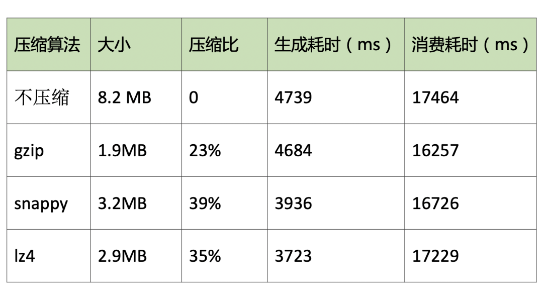 有文章对 Kafka 支持的三种压缩算法:gzip、snappy、lz4 进行了性能对比,测试 2 万条消息,效果如下: