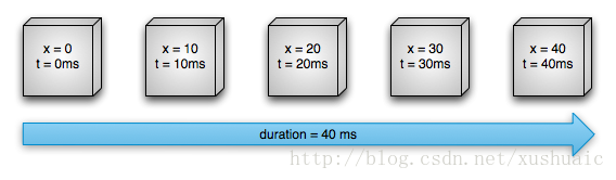 简单理解为匀速,下面描述了一个物体的X属性的运动。该对象的X坐标在40ms内从0移动到40 pixel,每10ms刷新一次,移动4次,每次移动40/4=10pixel。