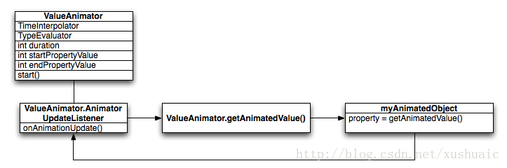 ValueAnimator 已经实现了TimeInterpolator和TypeAnimator接口,跟踪了动画时间的相关属性,比如一个动画已完成了多长时间,当前执行动画的开始、结束或属性值。