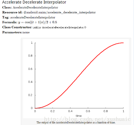 在下面的图中,也可以看到AccelerateDecelerate的Formula(公式)和其getInterpolation(input)方法相对应的函数值。