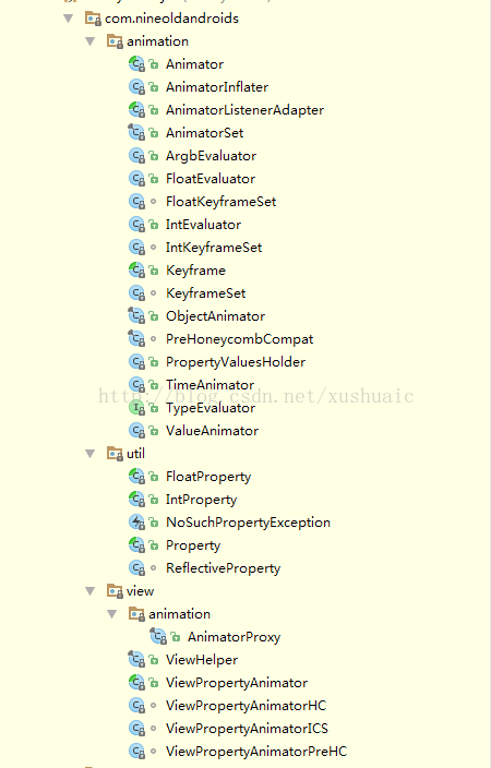 看一下系统的实现,既然之前的系统不支持属性动画,那么通过代理来处理initAnimation()方法里设置属性的时候,都是nineOldAndroid版本的ObjectAnimator提供的: setProperty(PROXY_PROPERTIES.get(mPropertyName));