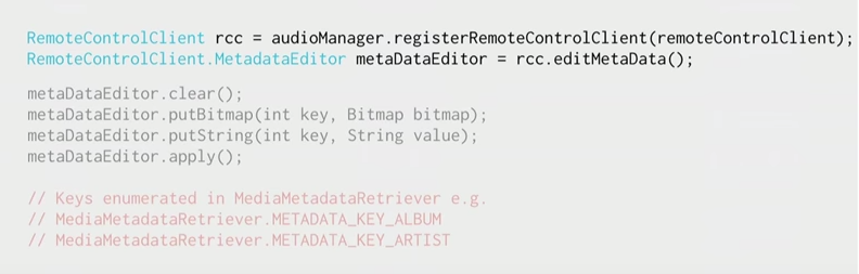 根据谷歌的说法,先往AudioManager里面注册一个RemoteControlClient实例,然后获取MetaDataEditor,往里面填充信息,然后执行MetaDataEditor.apply(),就是这么easy;
