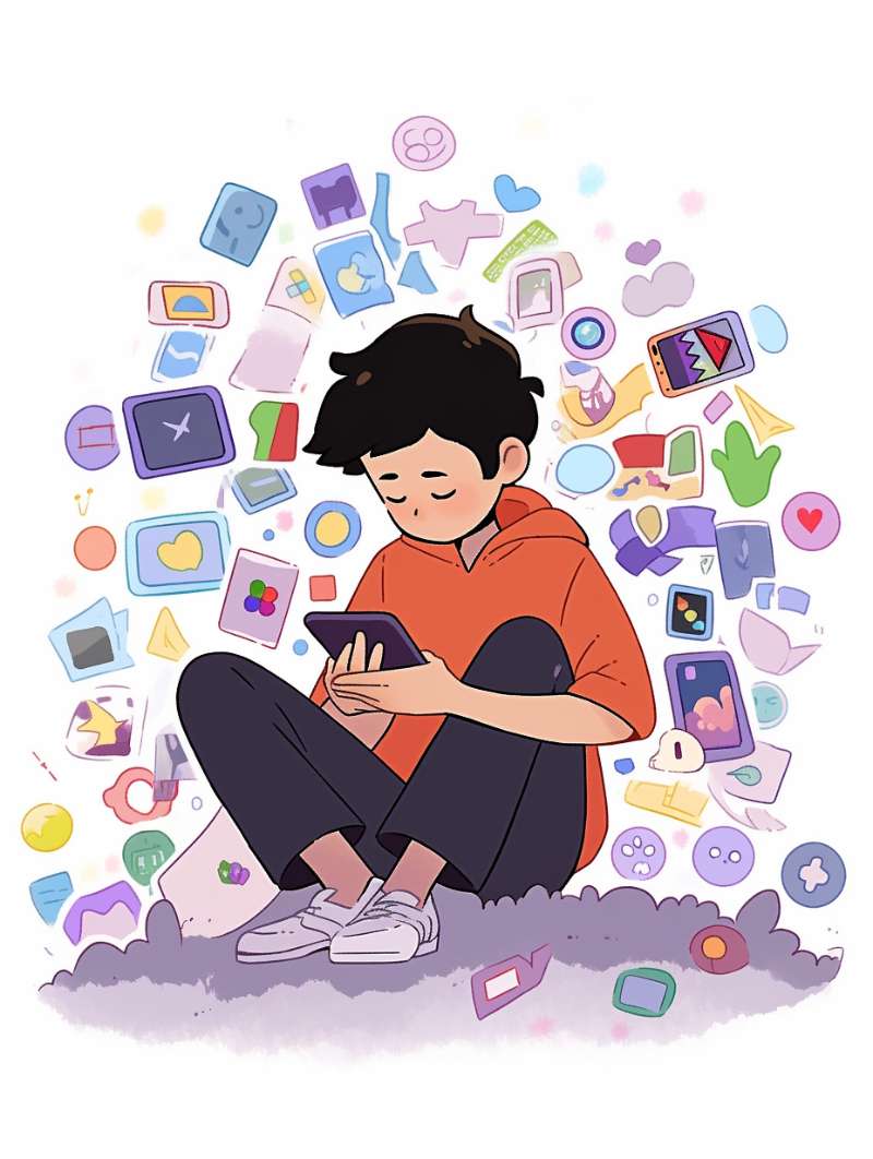 mj,a boy sitting on the ground looking social, addicted to mobile phones, in the style of media-savvy, colorful cartoon, clear backgroud, social media icons, manjit bawa, anti-form, mommy's on-the-phonecore --ar 3:4 --niji 5