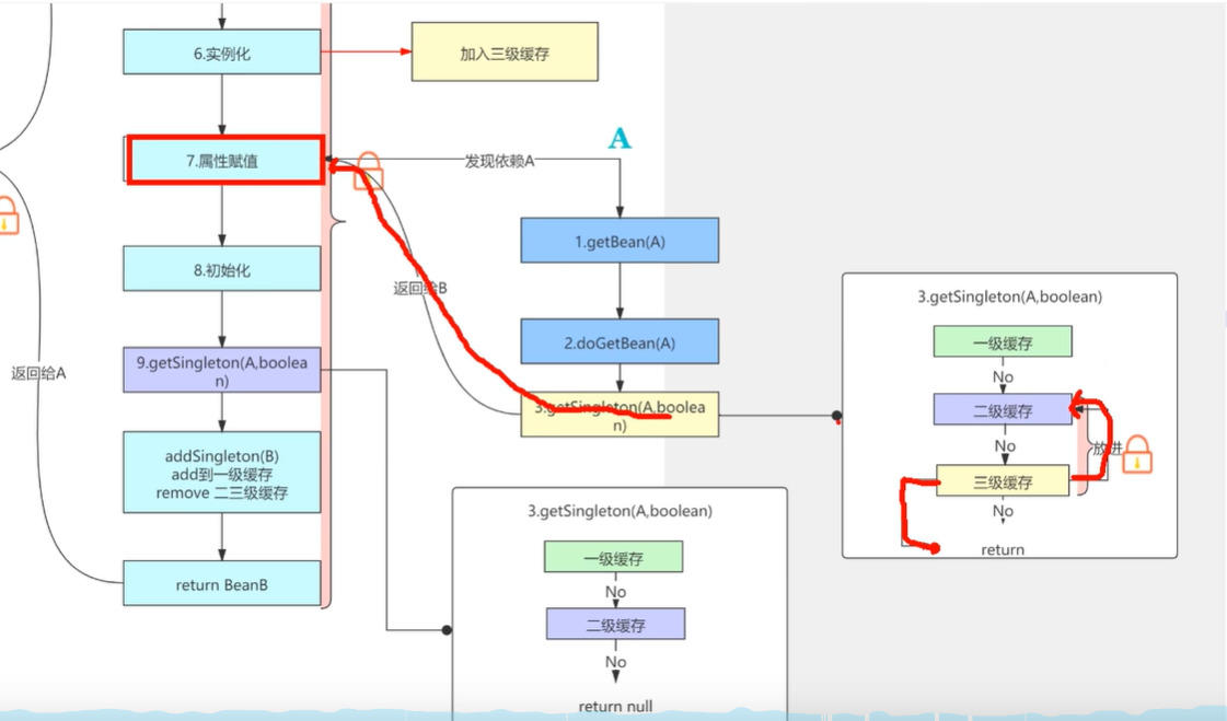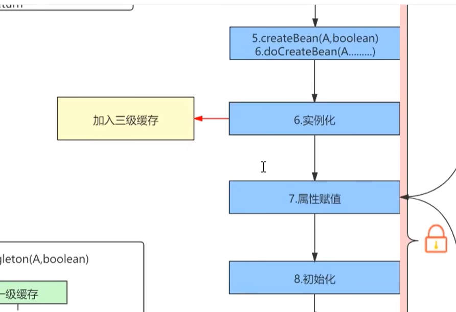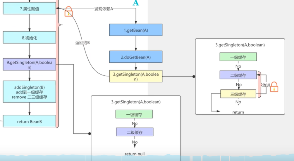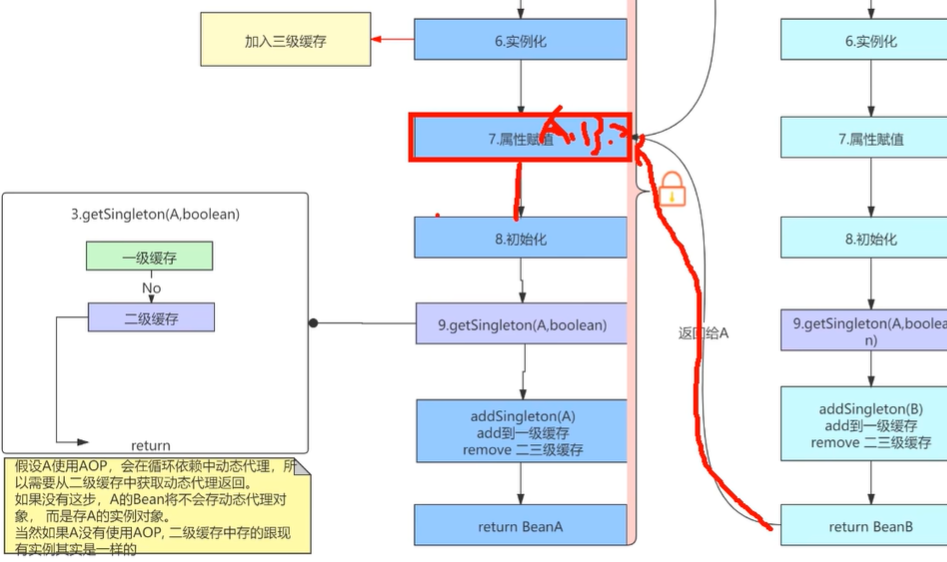 那么这个时候呢BeanA里面的BeanB就完成属性赋值了,然后BeanA又进行正常的一个初始化阶段了,最后returnA