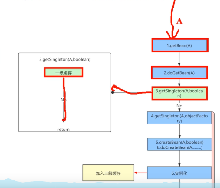 那么这个时候就去getBean(A)了,getBean(A)的时候呢,会先从一级缓存中当中拿。