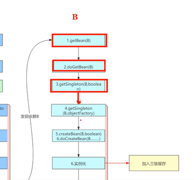 首先他会去这个通过这getSingleton,同样的去一级缓存当中找,首次创建肯定里面也是没有的,就会去创建Bean B了,创建BeanB呢 ,同样的实例化,同样的也加入到三级缓存,也就是说三级缓存这个函数接口把它保存了。