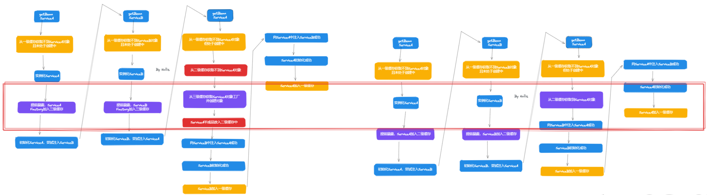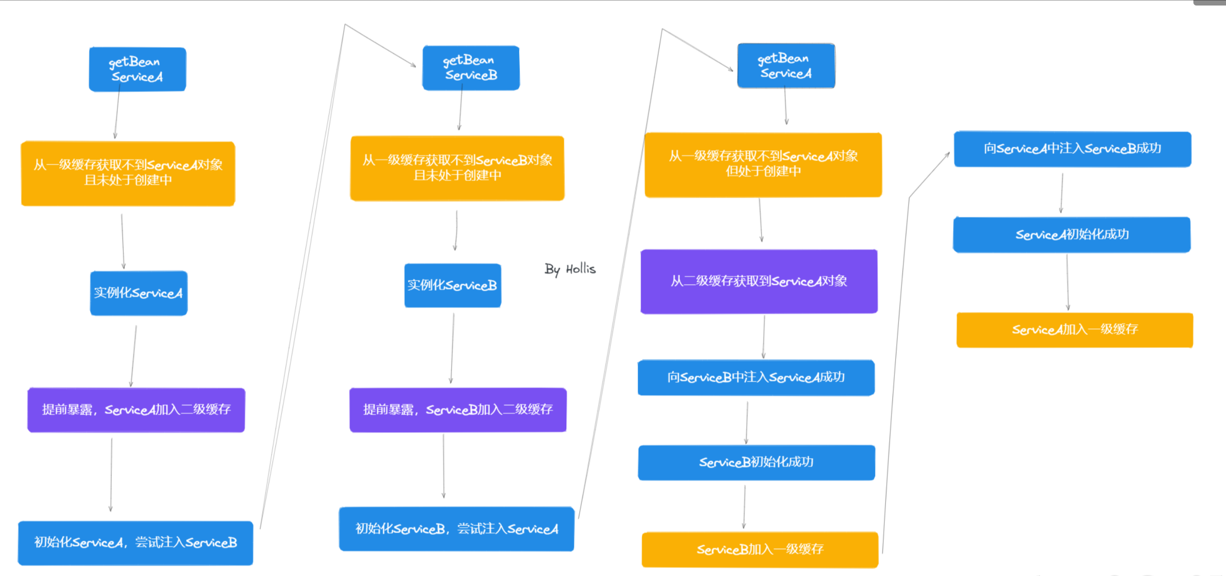 当两个Bean在初始化过程中互相依赖的时候,如初始化A发现他依赖了B,继续去初始化B,发现他又依赖了A,那这时候怎么办呢?大致流程如下:
