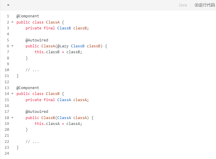 假设我们有两个类 ClassA 和 ClassB,它们之间存在循环依赖。我们可以使用 @Lazy 来解决这个问题