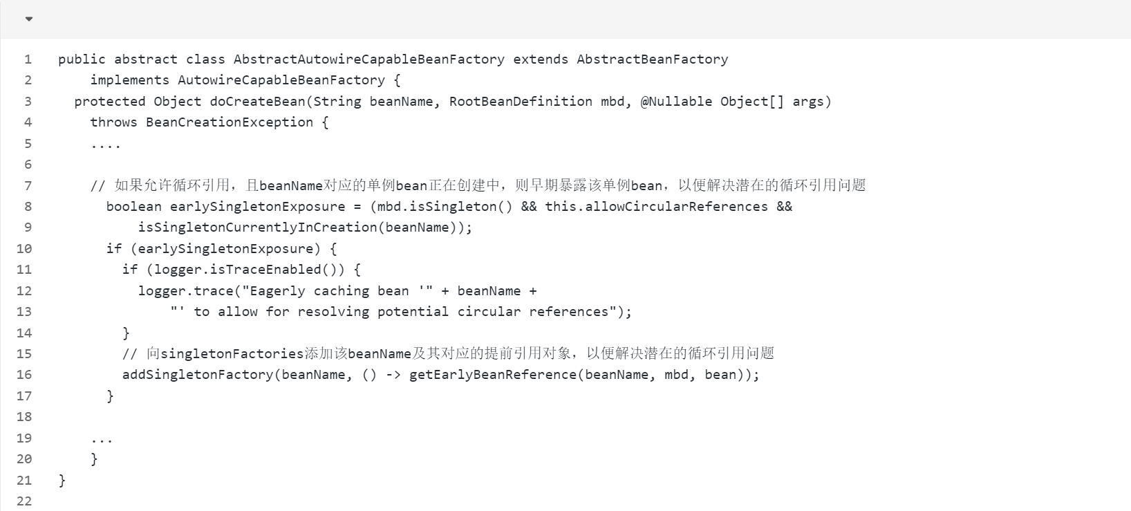 那怎么办好呢?Spring想到了一个好的办法,那就是使用三级缓存,并且在这个三级缓存中,并没有存入一个实例化的对象,而是存入了一个匿名类ObjectFactory(其实本质是一个函数式接口()->getEarlyBeanReference(beanName,mbd,bean)),具体代码如下: