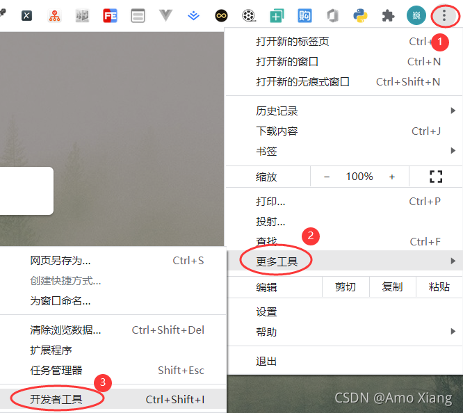 在浏览器中,单击自定义及控制 Google Chrome ⇒ 更多工具 ⇒ 开发者工具选项。如下图所示: