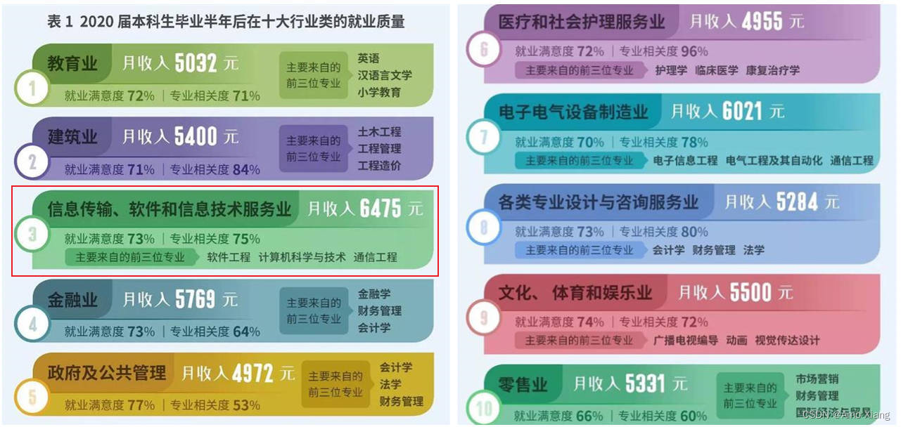 麦可思研究院发布过《2021年中国大学生就业报告》,应届本科毕业生就业数量较大的前十位行业类的就业质量: