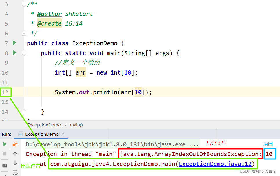 Java 中是如何表示不同的异常情况,又是如何让程序员得知,并处理异常的呢?Java 中把不同的异常用不同的类表示,一旦发生某种异常,就 创建该异常类型的对象,并且抛出(throw)。然后程序员可以捕获(catch)到这个异常对象,并处理;如果没有捕获(catch)这个异常对象,那么这个异常对象将会导致程序终止。举例:运行下面的程序,程序会产生一个数组角标越界异常 ArrayIndexOfBoundsException。我们通过图解来解析下异常产生和抛出的过程。