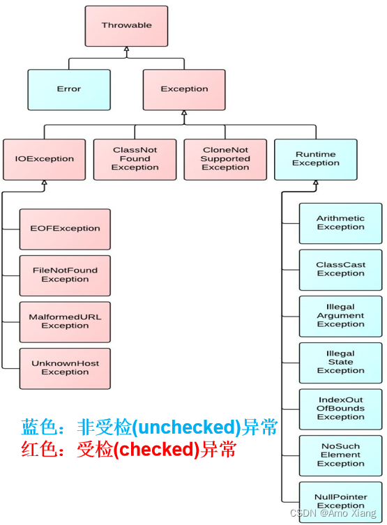 Error: Java 虚拟机无法解决的严重问题。如:JVM 系统内部错误、资源耗尽等严重情况。一般不编写针对性的代码进行处理。例如:StackOverflowError(栈内存溢出) 和 OutOfMemoryError(堆内存溢出,简称OOM)。