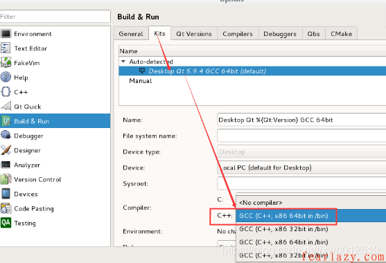 gcc c++安装完成后配置编译套件,如下图所示为c++选择编译器。