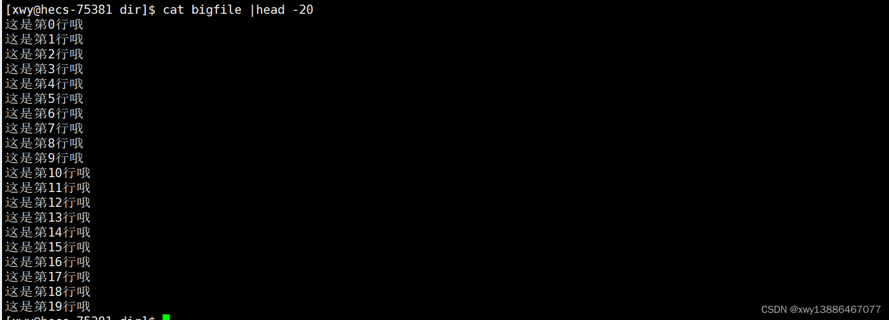 管道操作符|可以将一个命令的标准输出传送到另一个命令的标准输入中。如下:把cat输出作为head的输入,再显示前20行。