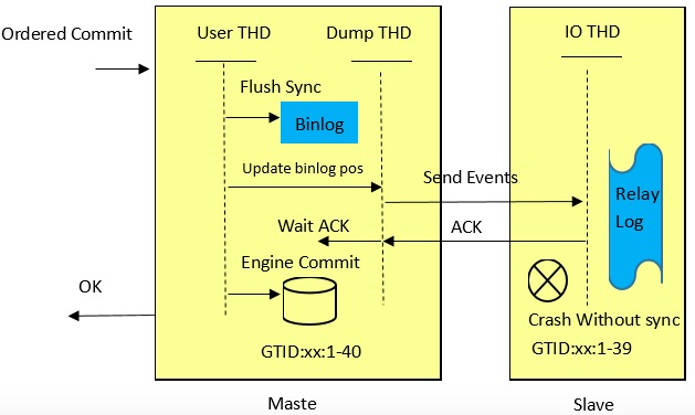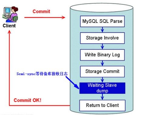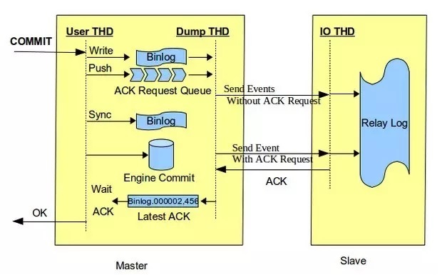 master将每个事务写入binlog , 传递到slave刷新到磁盘(relay log)。master等待slave反馈接收到relay log的ack之后,再提交事务并且返回commit OK结果给客户端。 即使主库crash,所有在主库上已经提交的事务都能保证已经同步到slave的relay log中。