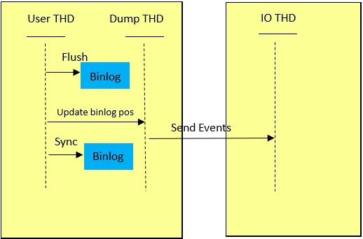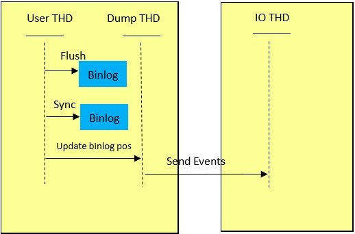 由于上面的原因,sync_binlog设置为1的时候,MySQL会update binlog end pos after sync。流程如下图所示。这时候,对于每一个事务都需要sync binlog,同时sync binlog和网络发送events会是一个串行的过程,性能下降明显。