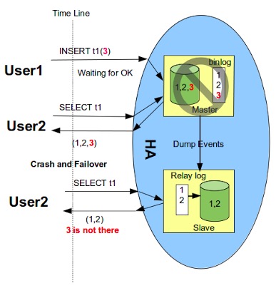 - 半同步复制意味着在Master节点上,这个刚刚提交的事物对数据库的修改,对其他事物是可见的。因此,如果在等待Slave ACK的时候crash了,那么会对其他事务出现幻读,数据丢失。