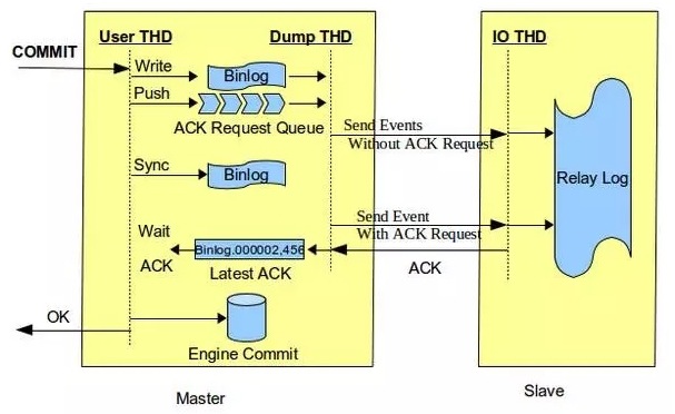 master将每个事务写入binlog(sync_binlog=1),传递到slave刷新到磁盘(sync_relay=1),同时主库提交事务(commit)。master等待slave反馈收到relay log,只有收到ACK后master才将commit OK结果反馈给客户端。