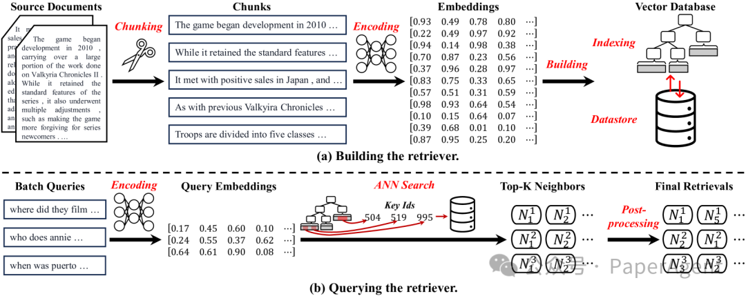 构建阶段:将文档分割成小块,对这些块进行编码,并建立索引以支持高效的检索。