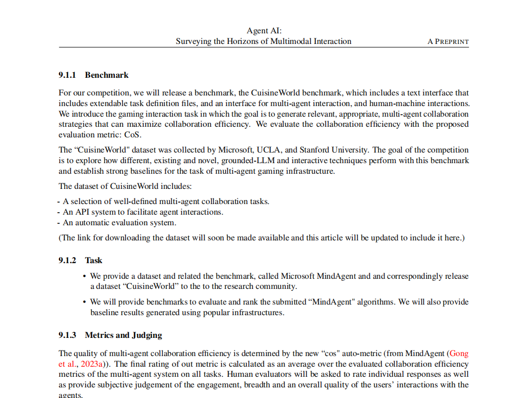为推动该领域的研究进展,我们针对多智能体游戏和智能体视觉语言任务,分别提出了两项基准测试。我们将发布两个新数据集(“CuisineWorld” 和 “VideoAnalytica”)以及一组基准模型,以此鼓励参与者探索新模型与新系统,并在我们的排行榜测试集上提交其研究结果。