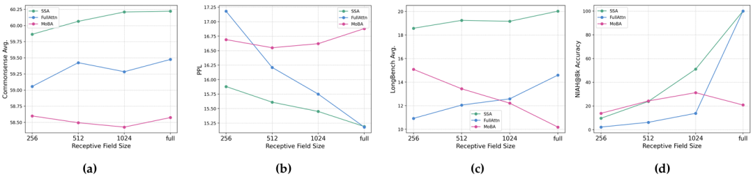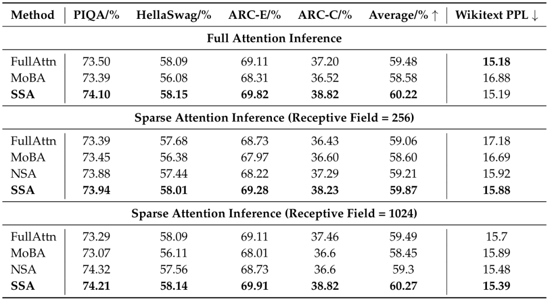 如表1所示,在PIQA 、Hellaswag 、ARC‑Easy以及ARC‑Challenge这些常识推理任务中,SSA 不仅优于所有稀疏基线,甚至以仅 256 的感受野(receptive field)超越了全注意力模型。两者在全注意力下的语言建模能力(PPL)相当,但 SSA 的下游任务性能显著更高。