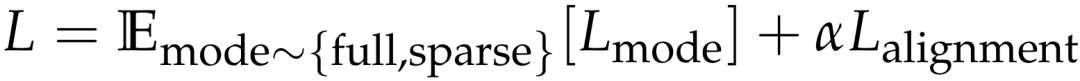 其中,Lmode表示在随机采样的注意力模式(全注意力或稀疏注意力)下计算的交叉熵损失,α 为权重系数,Lalignment为双向对齐损失,旨在促进全注意力与稀疏注意力输出的一致性。