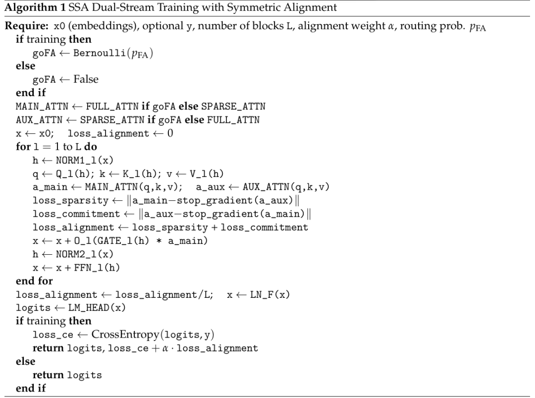 - 层级别的双向对齐损失,用以约束稀疏注意力与全注意力输出的一致性(详见算法1)。