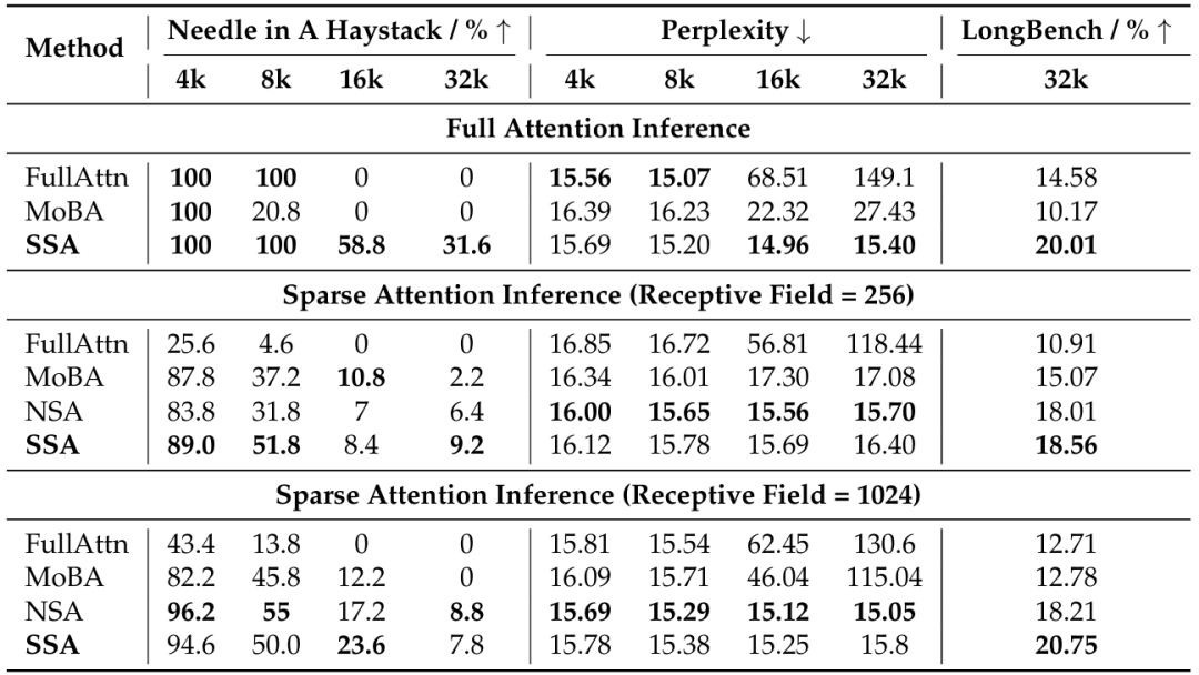 如表2所示,在大海捞针任务(Needle-in-a-Haystack)中,SSA 在几乎所有感受野下(除 1024 外)均为最强的稀疏注意力方法,并在全注意力推理下达到 100% 准确率。
