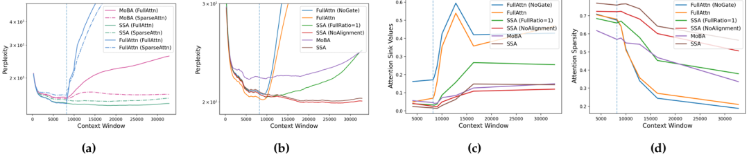 图4 (a) 不同上下文长度下的困惑度。(b) 在 SSA 中提高稀疏注意力训练的比例,可提升模型在长上下文上的外推能力。© 相较于 MoBA 和 FullAttn,SSA 在局部位置分配了更高的 logits 权重。(d) FullAttn 将大量注意力质量分配给了 8K 以外的 token。其中,图 (a) 使用 1B 参数模型,图 (b–d) 使用 300M 参数模型