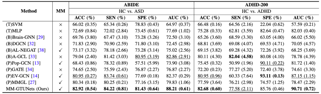 (iii) MM-GTUNets在两个数据集上均展现出卓越性能。在ABIDE数据集上,MM-GTUNets在所有指标上均超越所有对比基线方法。在ADHD-200数据集上,MM-GTUNets除敏感性和特异性外,在所有指标上均取得最佳结果。