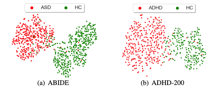 为评估MM-GTUNets学习跨模态交互的能力,该研究采用t-SNE在二维空间中可视化abide和ADHD-200数据集的模态联合表征Z。如图4所示,Z形成两个与类别相对应的独立聚类,表明MM-GTUNets学习到的多模态特征具有显著的区分能力,其类内离散度低而类间离散度高。