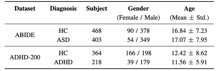 如表1,MM-GTUNets模型已在两个公开脑成像数据集(abide和ADHD-200)上进行评估。该研究采用rs-fMRI扫描作为神经影像学数据。由于原始数据中存在大量缺失或无效的场域,仅将受试者的性别、年龄及采集部位作为非影像学数据纳入分析: