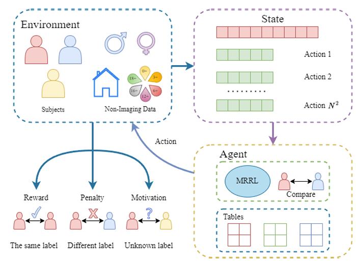 如图2,亲和度度量奖励系统(Affinity Metric Reward System,AMRS)中各种非影像数据的贡献权重比使用Q-Learning建模,使代理能够通过与环境互动、调整动作和更新 Q-table来学习最优策略。AMRS将每个受试者的两两比较,他们的非成像信息(状态)和标签(动作)被传输到 MRRL。然后,MRRL根据value值选择最优操作,允许特定的非成像数据具有更大的权重。value值是基于维护的奖励表、惩罚表和动机表这三个表计算得出的。通过与受试者群体及其非成像数据作为环境通过 MRRL 模块互动, AMRS 学习了每种非成像数据对应的注意力系数。