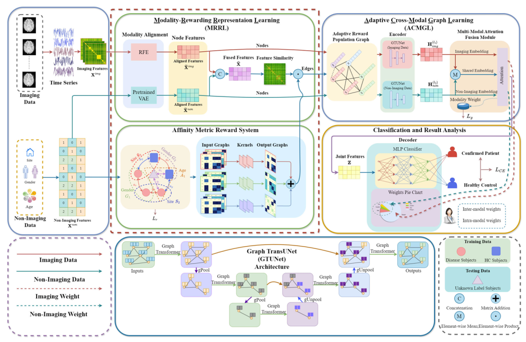 2025 年 9 月,上海海事大学、徐州医科大学附属连云港医院、上海科技大学及香港理工大学的研究团队在IEEE Transactions on Medical Imaging期刊上发表了题为《MM-GTUNets: Unified Multi-Modal Graph Deep Learning for Brain Disorders Prediction》的文章。研究提出了 MM-GTUNets 这一基于图 Transformer 的多模态图深度学习框架,通过模态奖励表示学习(MRRL)、自适应跨模态图学习(ACMGL)等核心模块,结合变分自编码器(VAE)实现多模态特征对齐,并利用融合 Graph UNet 与 Graph Transformer 优势的 GTUNet 编码器,精准捕捉模态内与模态间复杂关系,用于大规模脑疾病预测。